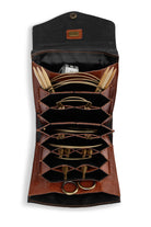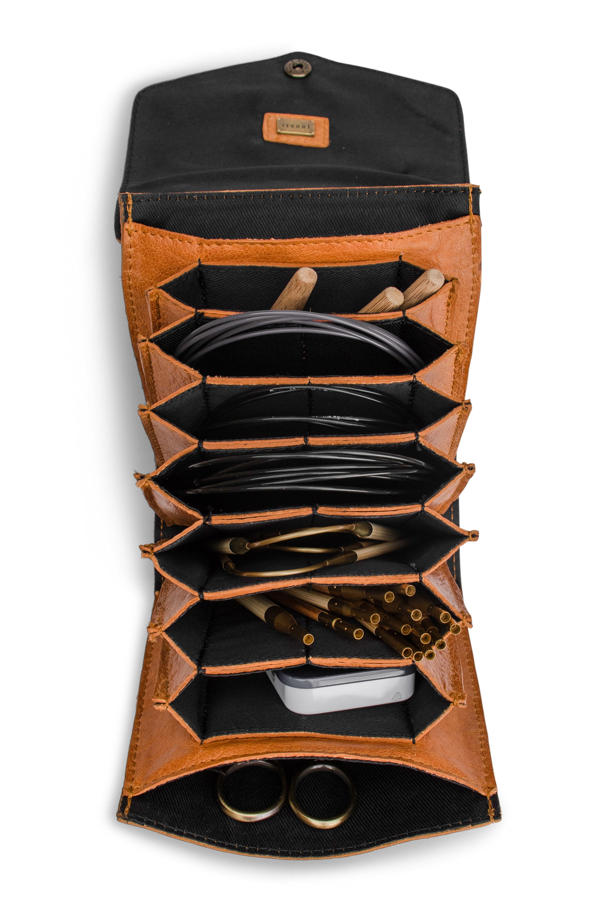 Nålevesken lukkes med en knapp for å sørge for at strikkeutstyret ditt holder seg inne i etuiet når du legger det i en pose. Knappen kan lukkes i to størrelser slik at du kan velge knappen som passer til innholdet ditt.