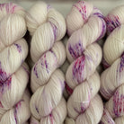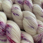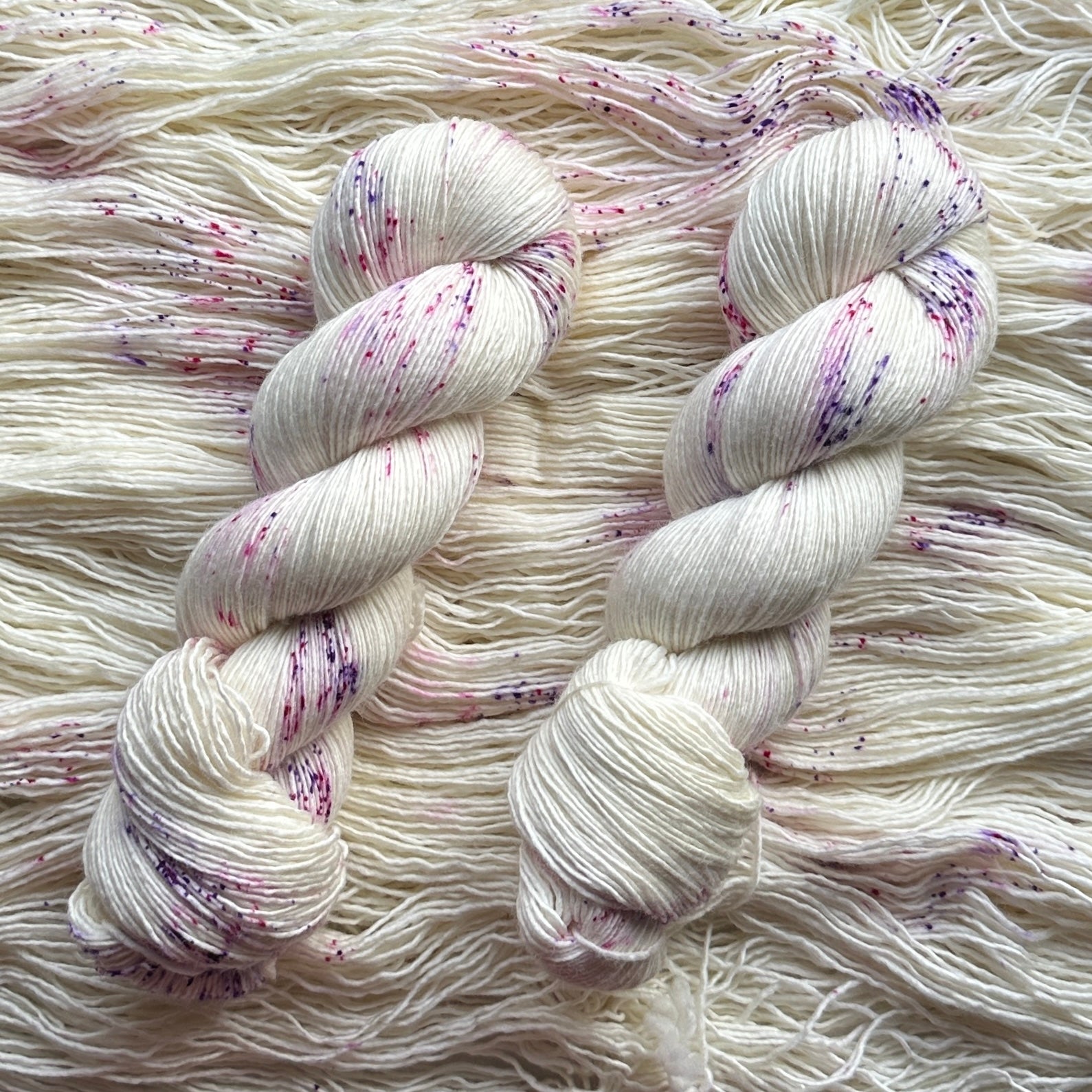 Håndfarget garn i den mykeste entrådige merinoullen med spetter i rosa og lilla.