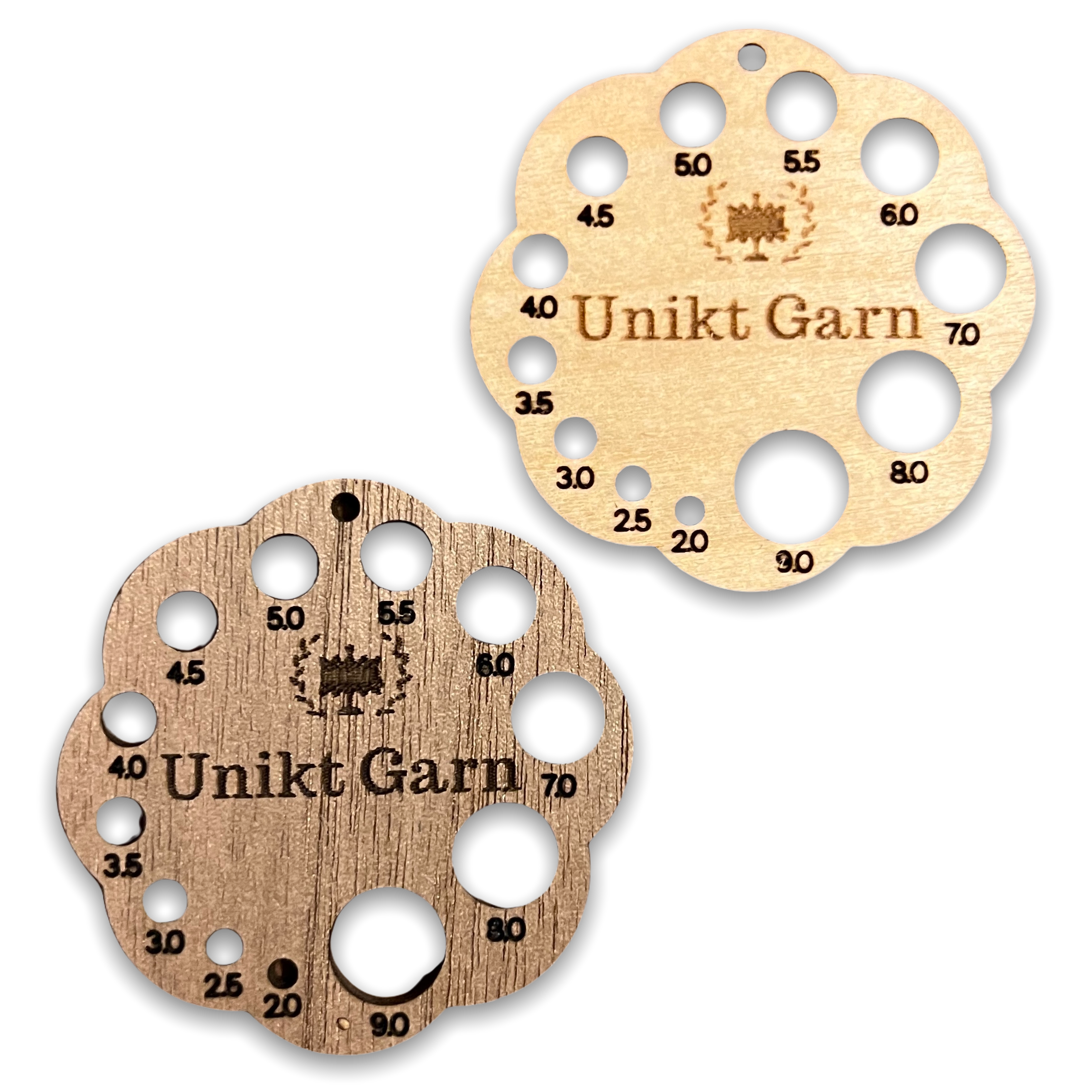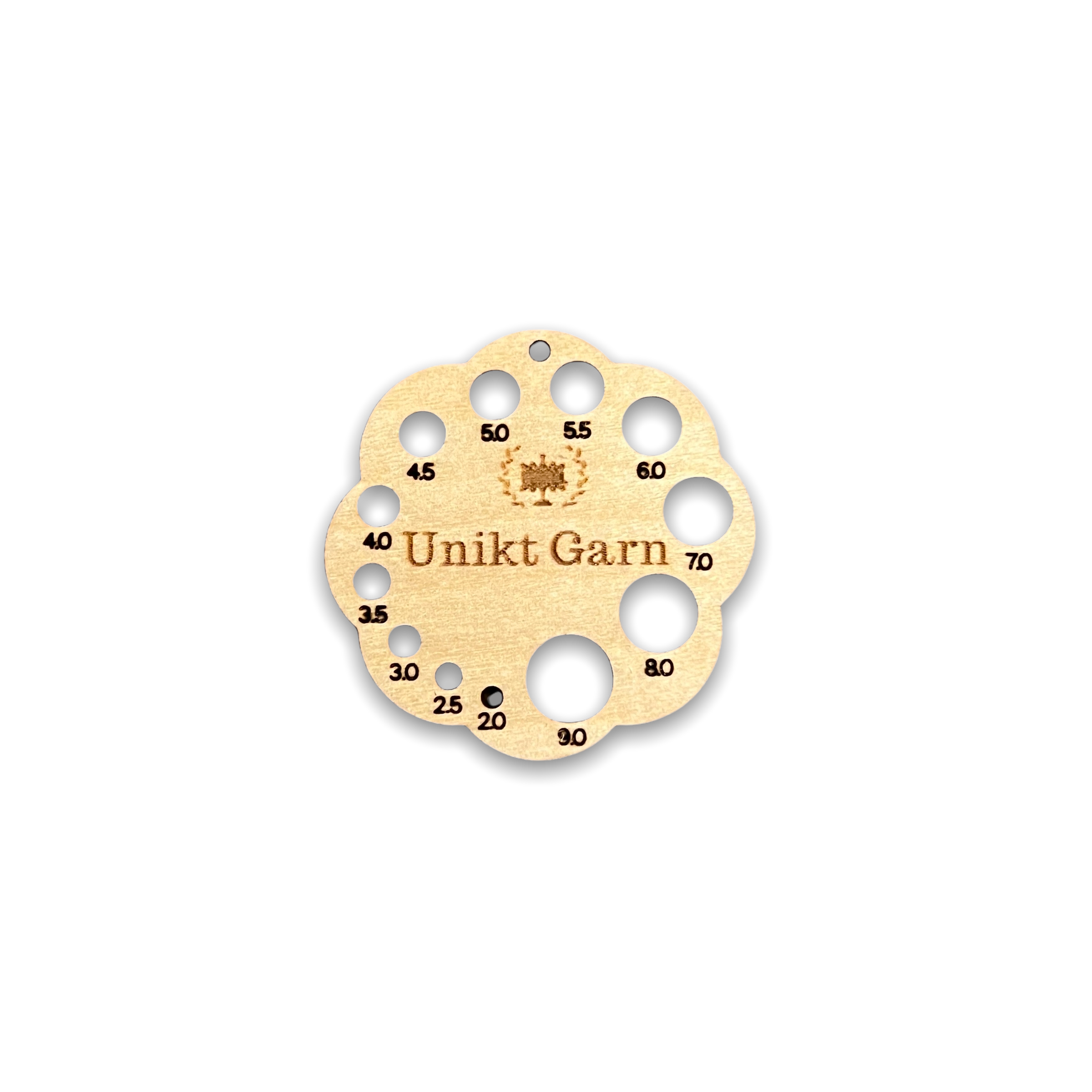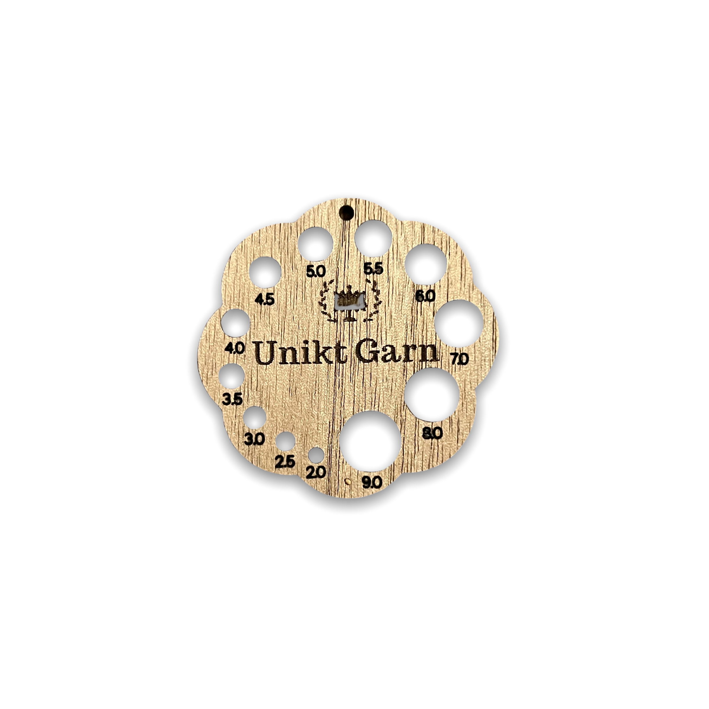 Knitting needle measure in hardwood with dimensions from 2 mm to 9 mm.