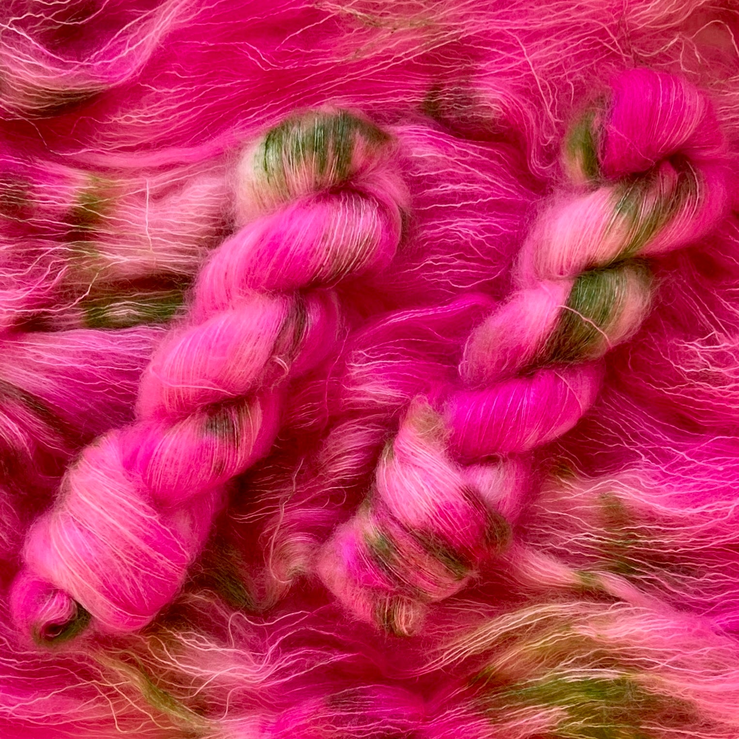 Handdyed yarn in wonderfully soft mohair/silk in crazy colours.
